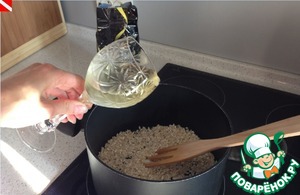 В тот момент, когда появляется приятный ореховый запах добавляем вино. И с этого момента будьте готовы мешать наше ризотто постоянно.