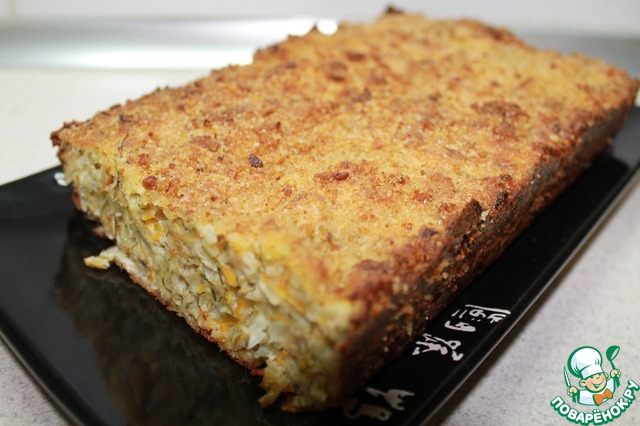 Форму для выпечки смазать маслом, обсыпать панировочными сухарями.