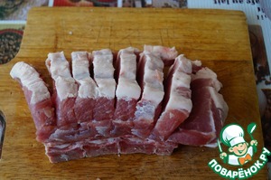 Берём поясничную часть свинины, моем, обсушиваем салфеткой или полотенцем. У меня такое мясо с костью, но можно готовить и бескостную часть. Режем на кусочки толщиной 1 см, не прорезая мясо до конца (если оно бескостное), или прорезая до кости, как у меня.