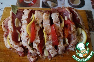 Натираем мясо приправой (лучше для гриля), солим, сбрызгиваем щедро соком лимона. В разрезы вставляем дольки лимона, помидора, раздавленные зубчики чеснока, лаврушку, посыпаем кориандром. Даём промариноваться приблизительно 40 мин -1 час.
