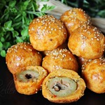 Эти крошечные булочки с оливкой внутри можно подать с бокалом вина или пива, пока гости ожидают ужин. Они также отлично подойдут для фуршета, пикника или позднего завтрака с шампанским.