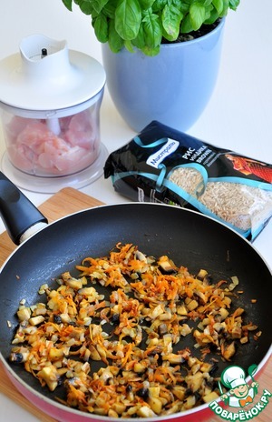 Лук, морковь и грибы помыть, почистить, лук и грибы мелко порезать, морковь натереть на терке. Обжарить на оливковом масле, посолить, поперчить, остудить.