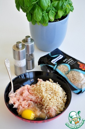 Смешать куриный фарш, остывший рис, яйцо, соль, перец ч. м. Смачивая руки в воде, сформировать маленькие котлетки, обвалять их в муке. Поставить на 20-30 минут в морозилку чтобы они хорошо держали форму.