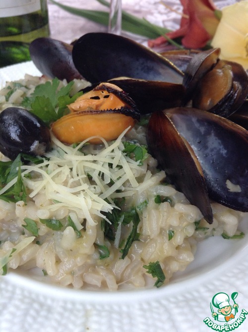 Выкладываем ризотто на тарелку, сверху кладем мидии, посыпем еще чуть-чуть сыром и зеленью.