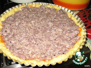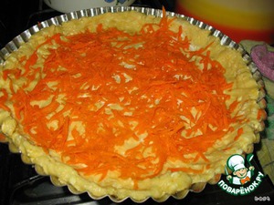 • Тесто выложить в форму. Сверху на него потереть сырую морковку. Добавить немного кетчупа.