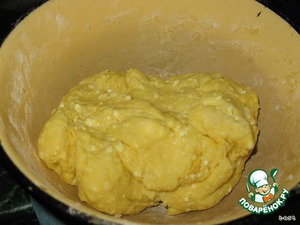 • Замешиваем тесто: взбить яйцо с творогом, добавить растопленное масло, соль и соду. Добавляем муки, пока не получится не липкое тесто.