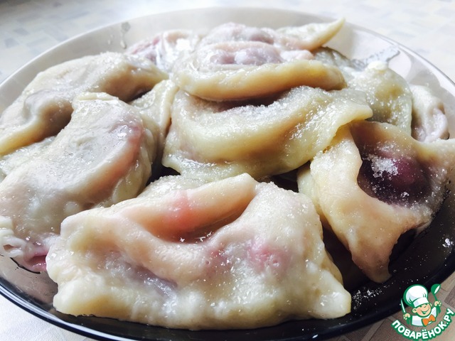 Укладываем по 2-3 вишни в середину и формируем вареники полумесяцем.