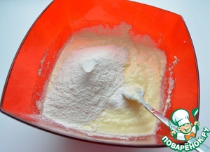 Добавляем просеянную с разрыхлителем муку. Всё хорошо перемешиваем.