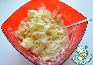 Яблоки очищаем, удаляем сердцевину, одну режем мелкими кубиками, вторую – дольками. Соединяем яблоки с тестом, перемешиваем.