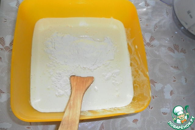 Добавляем просеянную муку с разрыхлителем, перемешиваем вручную деревянной лопаточкой, сверху вниз. Тесто должно получиться похожим на густую сметану и, главное, воздушным- это залог того, что и готовый бисквит будет таким же мягким и пушистым.