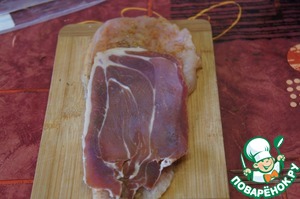 На пластинки мяса уложить тонкие ломтики бекона, -