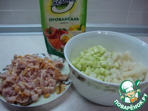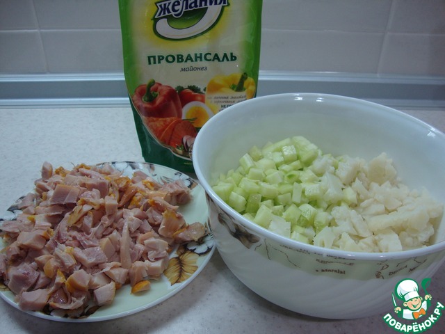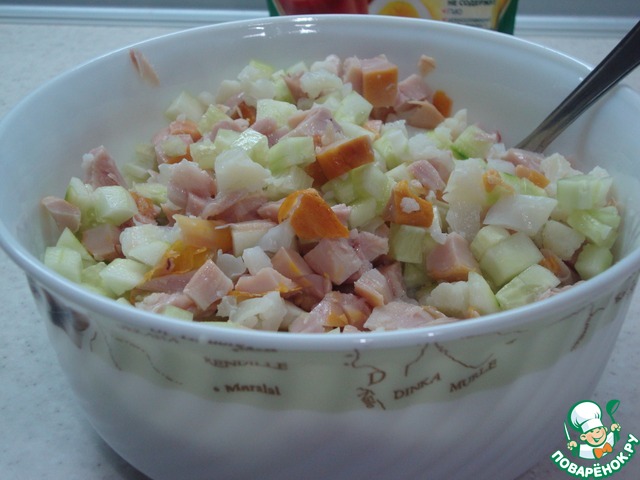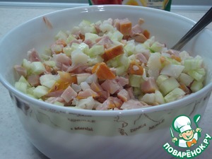 Все ингредиенты в равных пропорциях нарезать кубиками