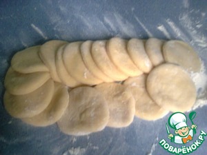 После того, как тесто подошло, берем часть и раскатываем тонко. Приблизительно 1,5-2 мм. Берем маленький стаканчик (5 см в диаметре) и начинаем выдавливать кружочки из теста.