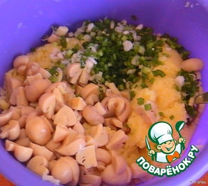 С мякоти сделать пюре, добавить масло, приправу, мелко порезанный лук и шампиньоны, в конце добавить пармезан, натертый на мелкой терке.