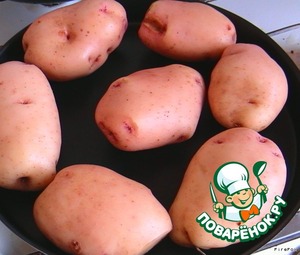 Хорошенько вымыть картошку и высушить, выложить на противень и запекать до готовности при высокой температуре, в зависимости от картошки (сорта и величины) от 30 минут до часа.