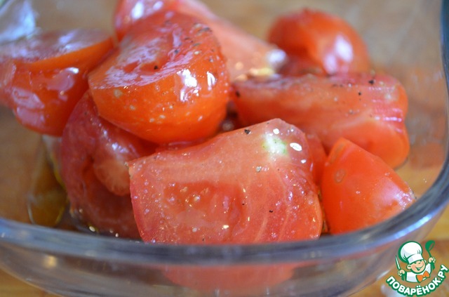 Пока варится рис замаринуем помидоры. если помидоры большие-нарежем их на 1/8 или 1/6 части. Если мелкие-пополам. Сверху немного посолим, поперчим и зальем смесью винного уксуса и оливкового масла (по 1ст. л)