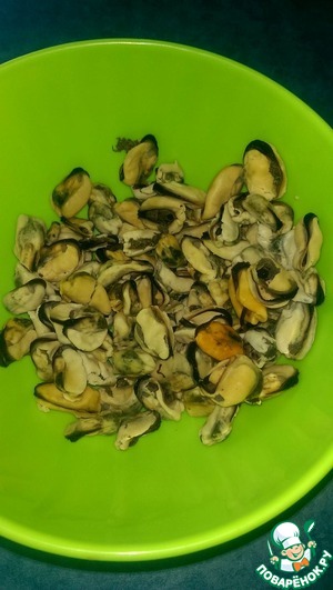 - Мидии (в готовом виде, беру пачку 500 гр) — 200 г
