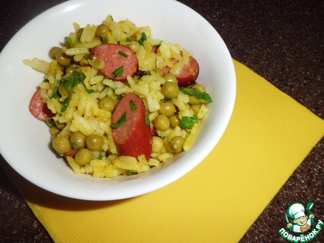 Когда рис будет готов добавляем горошек и чеснок (пропущенный через пресс), готовим ещё несколько минут и снимаем сковороду с огня. |