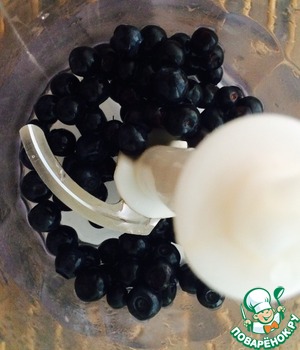 Пока курочка маринуется, приготовим соус. Горсть черники перемолоть в блендере. СОВЕТ для тех, кто не работал с черникой: эта ягода имеет свойства сильного красителя, поэтому пластмассовую (блендер) и деревянную (лопатка и дощечка) посуду мойте сразу после приготовления ягоды, чтобы она не окрасилась в синий цвет)) Стеклянная посуда не окрасится.
