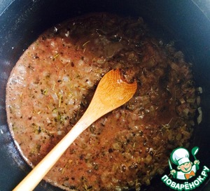 Влейте красное сухое вино. Проварите несколько минут (3-5), вино немного выпариться.