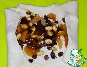 Достала 500 г пакетик с тестом из морозильной камеры и разложила каждый лист на силиконовый коврик для раскатывания теста. Курагу и изюм залила тёплой водой. Подсушила на сковороде арахис и очистила от шелухи. На это ушло не более 15 минут. Сухофрукты переложила из воды в сито и промыла проточной водой. Сито встряхнула и высыпала их на мягкие, бумажные салфетки, чтобы убрать влагу. Листы теста раскатала на более тонкие и разложила равномерно сухофрукты. Курагу разрезала на несколько частей. Подсушенные орехи разложила сверху сухофруктов.