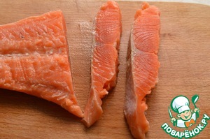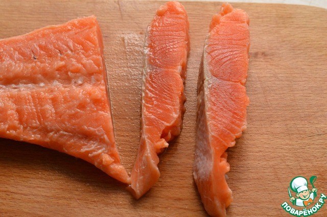 1. Филе лосося нарезать пластинками, посолить, посыпать травами, сбрызнуть оливковым маслом, завернуть в фольгу и запечь в духовке при 180С до готовности примерно 15 минут.