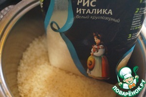 Рис можно брать любой. Я выбрала сорт "италика" белый круглозёрный от "Мистраль". Отмеряем нужное количество и отвариваем по инструкции.