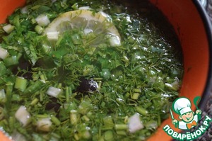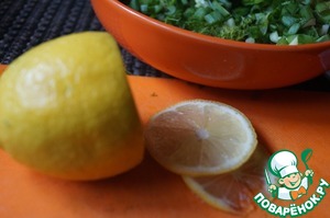 Пока варится рис - готовим остальные ингредиенты. Я не дала в рецепте точное их количество, скоро вы поймёте почему. Зелень мелко нарезаем. Лимон режем тонкими дольками.