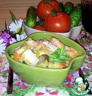 Ризотто с курицей, грибами, креветками и овощами