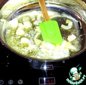 Половину масла растопила и обжарила лук. ( Я жарила в новой сковороде Вerg Hoff, дно которой диамертом 26 см, верх 28 см. Сковорода, как раз подошла к плите Oursson. Вот только со вспышкой фотографировать, отсвечивает. А без вспышки фото тёмное.)