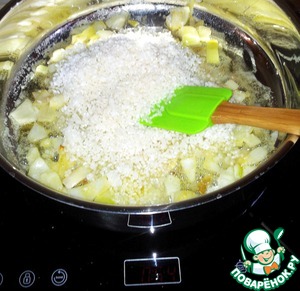Для приготовления ризотто специальной посуды не требуется, вы можете взять обычную сковороду средней глубины. На нее следует выложить сливочное масло, слегка обжарить в нем мелко нарезанный лук, всыпать к нему рис и влить необходимое количество вина. Рис во время приготовления ризотто следует размешивать как можно чаще, чтобы он лучше разварился и стал похож на кашу.