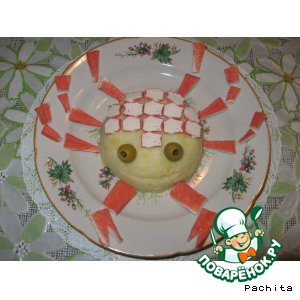 Оставшуюся крабовую палочку нарезаем кружочками. Укладываем сверху на "туловище" - это "панцирь".