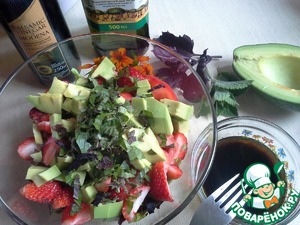 Листья салата (у меня микс) рвем руками на небольшие кусочки в салатник, авокадо очищаем и нарезаем крупно, клубнику разрезаем на половинки, помидор режем крупными кусочками, базилик и мяту измельчаем и добавляем. В отдельной небольшой емкости смешиваем уксус, оливковое масло, соль и перец, взбиваем смесь вилкой до однородности.