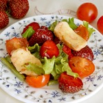 Салат со свежей клубникой, авокадо и жареным сыром халуми. Клубничными десертами уже насытились (на какое то время, конечно) и я решила побаловать своих легким, освежающим и вкусным салатом. В салате приятную кислинку винного уксуса сменяет приятная сладость клубники, а сыр придает ему некую основательность. Очень удачное сочетание ингридиентов приятно удивит вас. Идея взята из журнала "Гастроном".