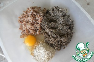 Гречку отвариваем. Соединяем шампиньоны, 7 ст. л. вареной гречки, яйцо, овсяные хлопья ( я слегка помолола на кофемолке, не хотела в котлетках целые хлопья), солим, перчим.
