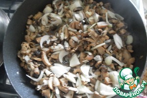 Грибы моем и нарезаем произвольно вместе с луковицей. Обжариваем шампиньоны с луком на растительном масле.