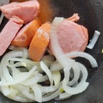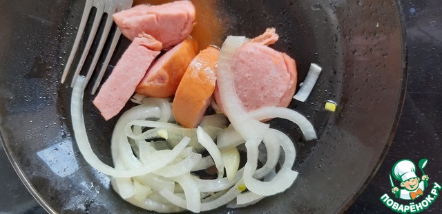 Потом положим шпикачек и снова слой лука. Сантиметр, примерно.