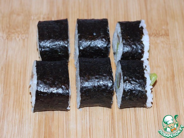 Приготовьте небольшую тарелочку с васаби и уксусную воду (тезу) для смачивания рук (просто налейте кипяченую воду в посуду и добавьте пару столовых ложек рисового уксуса). Берем влажной рукой небольшую горсть остывшего риса и распределяем тонким слоем без просветов по всему листу нори (оставив лишь в конце 1 см. пустым для того, чтобы потом хорошо свернуть и скрепить). Выдавить пасту Васаби на палец (горошину) и, отступив от края 2 см, нанести пасту вдоль листа (провести полоску).