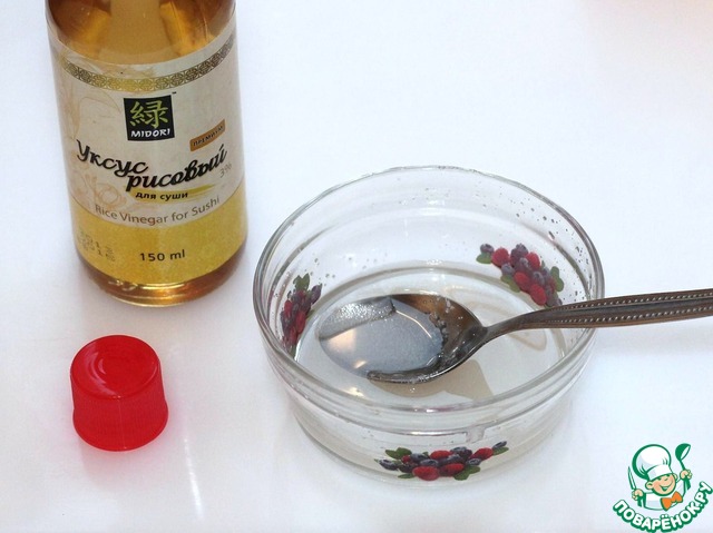 Промойте рис до чистой воды. Выложите его в кастрюлю, залейте водой и оставьте на полчаса набухать. Затем поставьте на огонь и доведите до кипения. Убавьте огонь до минимума и варите рис еще 10 мин. Выключайте огонь и дайте рису потомиться 20 мин. Выложите рис на лист пергамента, побрызгайте готовым уксусом и перемешайте режущими движениями. Затем переложите рис в посуду, прибавьте подготовленный уксус и снова перемешайте режущими движениями.