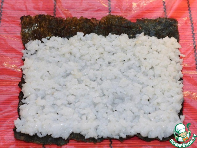 Ровным слоем выложите рис поверх листа нори.