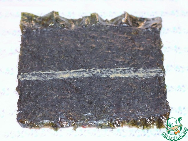 Разложите лист нори (блестящей стороной вниз) на бамбуковой циновке.