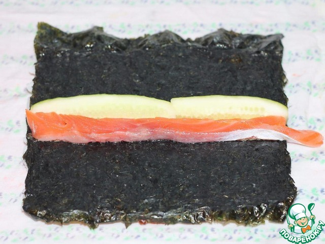 При помощи циновки начните закатывать рулет, оставляя внешний край листа нори шириной 2,5 см. Приподняв циновку, прокатите рулет еще 1-2 раза вперед, усиливая нажим, чтобы свободный край листа нори плотно прилег по всей длине рулета.