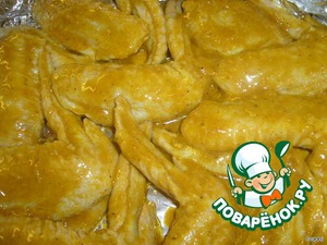 Хорошо обмазать маринадом крылышки со всех сторон, выложить в глубокую посуду, накрыть пищевой пленкой и поставить в холодильник на 60 минут.