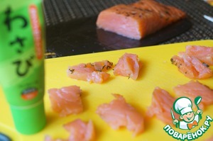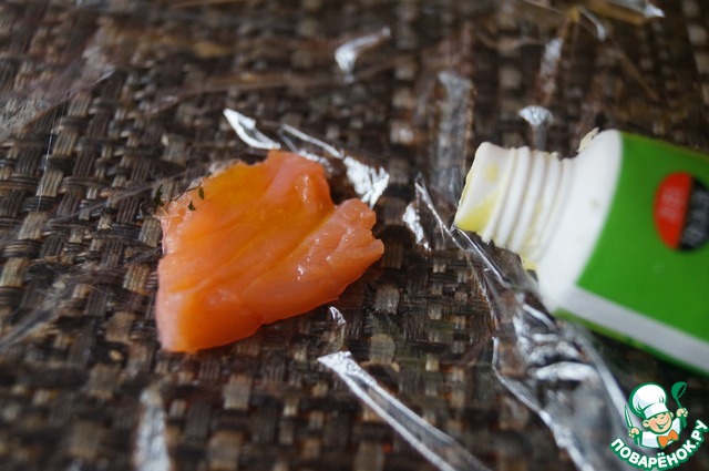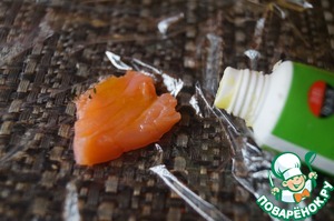 На квадрат пищевой плёнки кладём кусочек рыбы. Смазываем васаби.