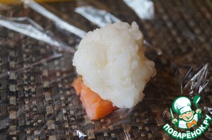 Сверху кладём комок риса, размером с небольшой грецкий орех. Рис берём руками, смоченными водой с рисовым уксусом.