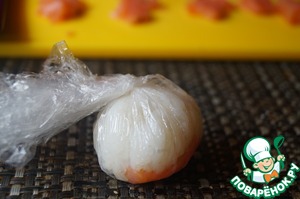 Собираем концы пищевой плёнки вверх и закручиваем. Если нужно, пальцами помогаем сформировать аккуратный шарик.