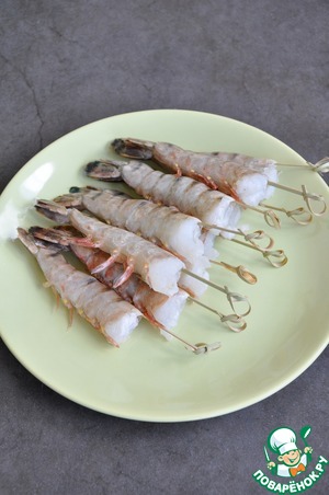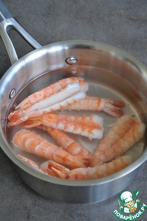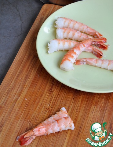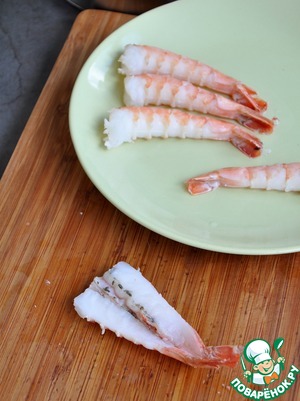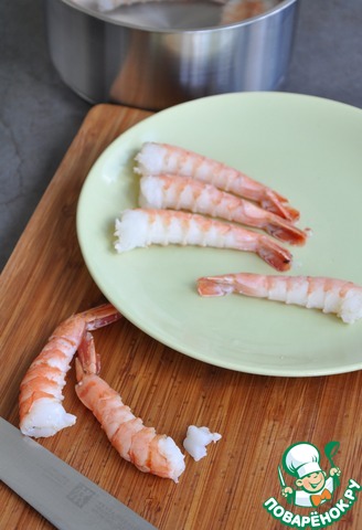 Отварить креветки в кипящей воде 2 минуты. Вынуть шпажку, очистить от панциря, хвост оставить. Отрезать выступающий кусочек мяса внизу.