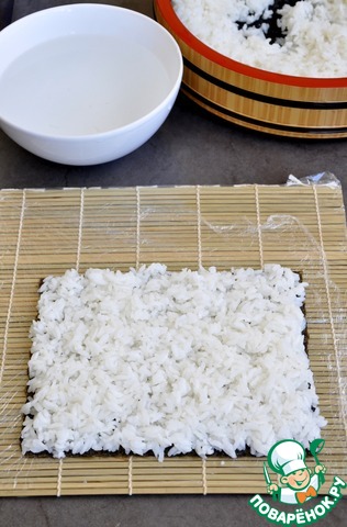 Для "Неаполь маки" коврик для суши макису следует обернуть пищевой пленкой. Выложить на него водоросли нори, отрезать от них 8см. Выложить нори глянцевой стороной на коврик затем рис для суши, постоянно смачиваем руки в воде.