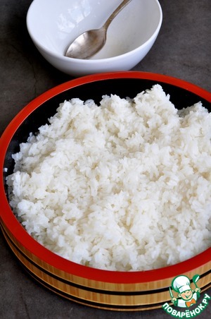 Переложить рис в стеклянную или деревянную посуду, залить рисовой заправкой, перемешать.