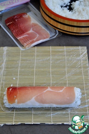 Один ролл накрываем слайсом пармы. Оба ролла накрыть пищевой пленкой.